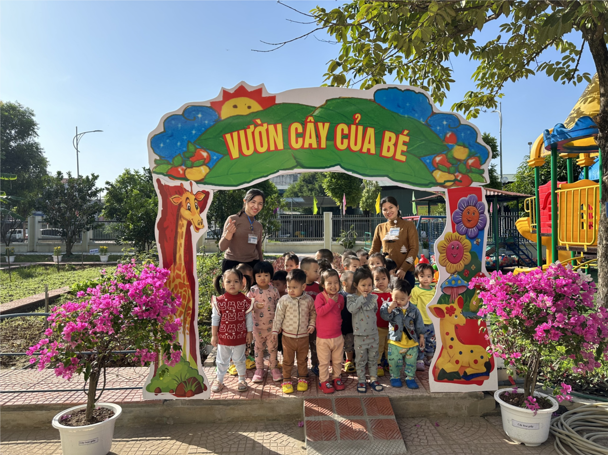 Cô và trẻ tham quan vườn cây của bé