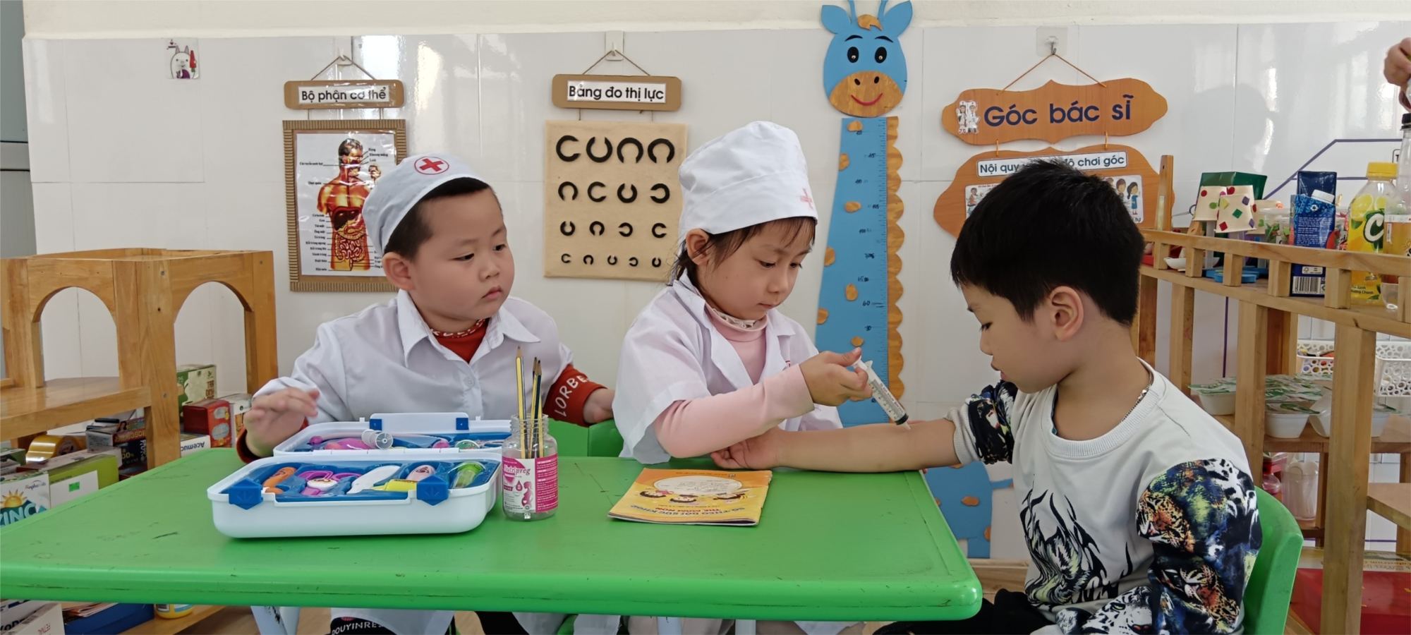 Trẻ tham gia vào các góc chơi ở lớp như: Góc bán hàng; Góc xây dựng; Góc toán; Góc sách truyện; Góc tạo hình - âm nhạc; Góc khám phá; Góc bác sĩ; Góc nấu ăn…Ở mỗi góc chơi trẻ đều được học những kiến thức, kỹ năng khác nhau và quan trọng hơn cả là trẻ có cơ hội được thể hiện mình và biết phối hợp cùng các bạn tham gia các hoạt động.