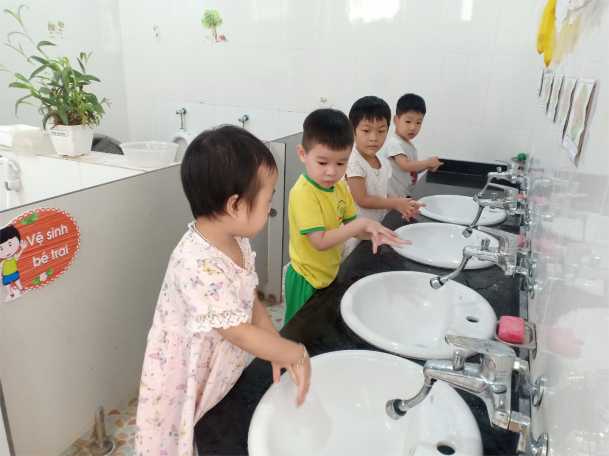 Để tạo hứng thú cho trẻ bước vào giờ ăn thì việc thực hiện đúng các thao tác rửa tay bằng xà phòng, lau mặt cũng góp phần tạo tâm thế thoải mái, sảng khoái cho trẻ trước khi vào giờ ăn. Trong giờ ăn, cô giáo luôn tạo sự vui vẻ, chăm sóc ân cần, nhẹ nhàng, động viên trẻ lấy thức ăn theo nhu cầu để bữa ăn vừa đem lại sức khỏe vừa đem lại niềm vui và hứng thú cho trẻ. Cô không trách phạt, cáu gắt khi trẻ ăn. Cô động viên trẻ ăn ngon miệng, ăn hết phần mà bản thân trẻ tự lấy, ăn từ tốn, nhai kỹ, không nói chuyện trong giờ ăn. Cô quan tâm đặc biệt đối với trẻ ăn yếu, khó ăn nhằm đảm bảo cho trẻ ăn ngon. Khi trẻ ăn, cô bao quát, uốn nắn các kỹ năng cho trẻ một cách phù hợp đồng thời giáo dục về nhận thức và thẩm mỹ cho trẻ