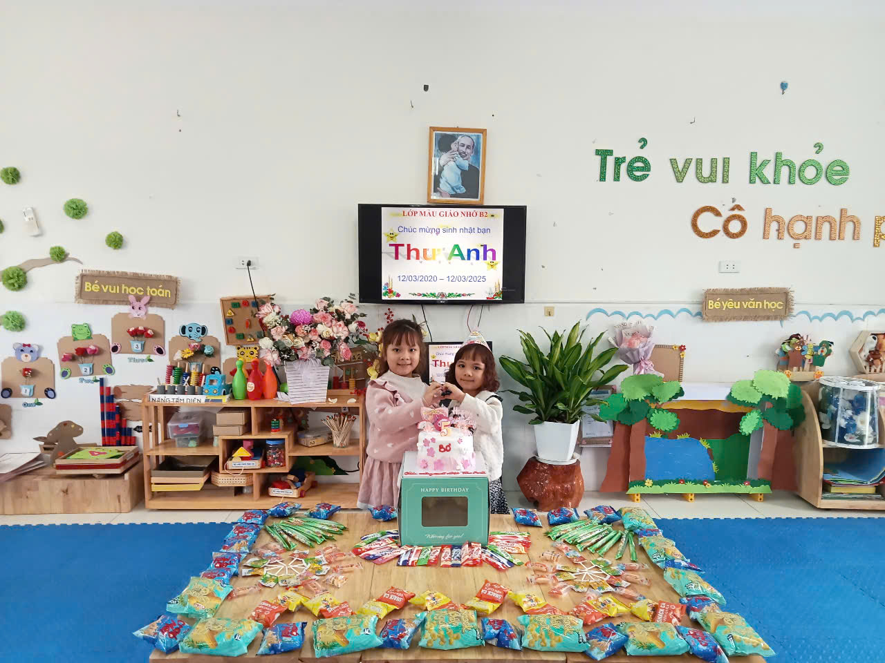Còn điều gì vui hơn khi gia đình- cô giáo- bạn bè ngồi quây quần cùng hát vang HAPPY BIRTH DAY và cùng nhau trao nhau những lời chúc ngọt ngào, những món quà đầy ý nghĩa cùng những lời chúc các bạn tuổi mới: HỌC CHĂM NGOAN - ĂN NHIỆT TÌNH - CHƠI HẾT MÌNH CHO MAU LỚN.