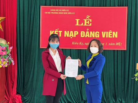 Thay mặt cho toàn thể đảng viên Chi bộ trường mầm non Kiêu Kỵ, đồng chí Đinh Thị Tố Doan – Bí thư Chi bộ trường mầm non Kiêu Kỵ đã trao quyết định kết nạp đảng viên mới, phổ biến nhiệm vụ và quyền hạn của người đảng viên, giao nhiệm vụ của chi bộ cho đảng viên mới, cử đảng viên chính thức của chi bộ tiếp tục theo dõi, giúp đỡ 2 đồng chí đảng viên mới: