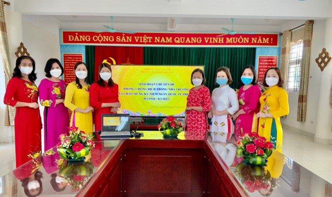 Đồng chí Đinh Thị Tố Doan – BT chi Bộ- Hiệu trưởng nhà trường đã chúc mừng các chị em nhân ngày 8/3, đồng chí đánh giá khái quát một số hoạt động của các đoàn thể trong nhà trường chào mừng ngày quốc tế phụ nữ 8/3 như công tác duy trì lịch vệ sinh các phòng nhóm lớp, cá nhân từng thành viên trong tổ hưởng ứng tuần lễ áo dài...Trong buổi mít tình còn lồng chuyên đề “Phòng chống dịch trong nhà trường”. Thông qua trò chơi “Hái hoa dân chủ” đã mở ra ra rất nhiều lượng kiến thức về phòng chống dịch bệnh, tìm hiểu triệu chứng của người mắc covit cách phòng chống, cách xử lý của giáo viên khi có học sinh nghi mắc covid tại trường, thông điệp 5k của Bộ y tế v.v.