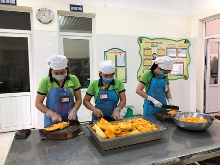 Ngoài ra, nhân viên nuôi dưỡng luôn thực hiện tốt công tác vệ sinh trong và ngoài bếp, sắp xếp đồ dùng gọn gàng, đúng nơi quy định, để riêng đồ dùng sơ chế sống, chín. Đồ dùng như thùng,bát, thìa,... được rửa sạch, úp khô vào tủ kính và tráng nước sôi, hấp sấy trước khi sử dụng.