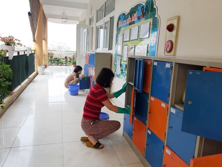 Ngày 25 tháng 2 năm 2021, 100% các lớp học, bếp ăn, các phòng ban đều được vệ sinh sạch sẽ, nền nhà sạch sẽ, khô ráo,... đồ dùng đồ chơi được cọ rửa và phơi dưới ánh nắng. Đồ dùng cá nhân như cốc, khăn mặt được cọ, giặt sạch sẽ, cốc được luộc nước sôi. Các đồ dùng như bát, thìa,... được cọ rửa được hấp sấy đúng quy định. Môi trường xung quanh được làm sạch cỏ, không có rác và nước ứ đọng. Cây cối được cắt tỉa, khơi thông cống rãnh. Môi trường đảm bảo xanh - sạch - đẹp.