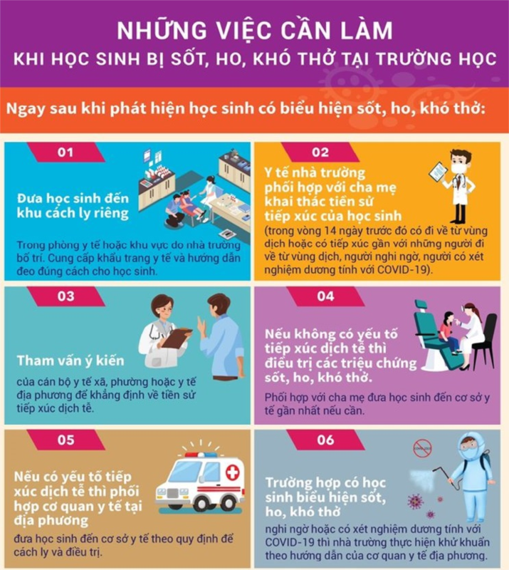 4. Nếu không có yếu tố tiếp xúc dịch tễ thì điều trị các triệu chứng sốt, ho, khó thở. Phối hợp với cha mẹ đưa học sinh đến cơ sở y tế gần nhất nếu cần.